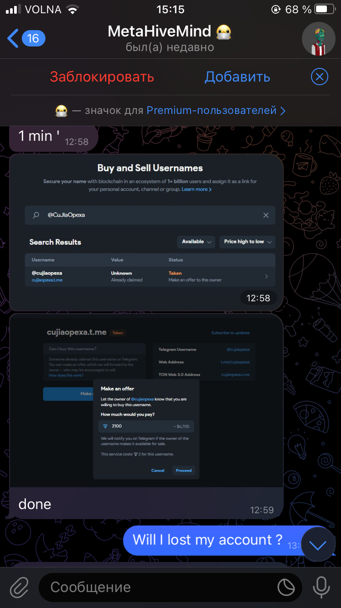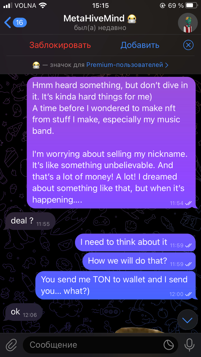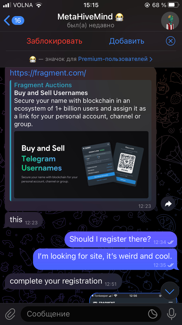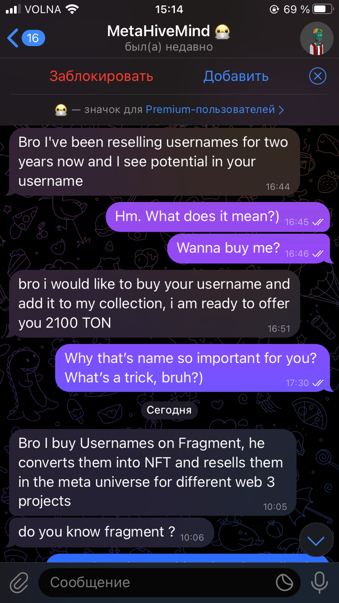 Может кому будет полезно. Сразу к сути: написал мне в личку «англичанин» и пишет соответсвующе, мол хочет купить мой username в telegram через площадку fragment. Предложил кучу денег, я начал искать инфу и понял, что это развод. По итогу, я, почему-то, написал ему в личку по-русски, -«переводи деньги, а я, как честный человек, отдам тебе логин/пароль». На что он мне моментально начал на чистом русском отвечать, что я не честный человек, что он мне не верит и поругался.