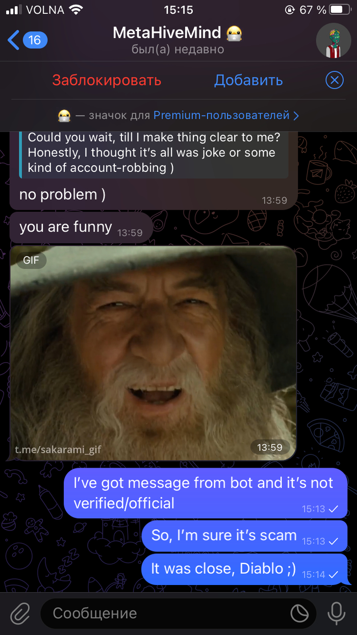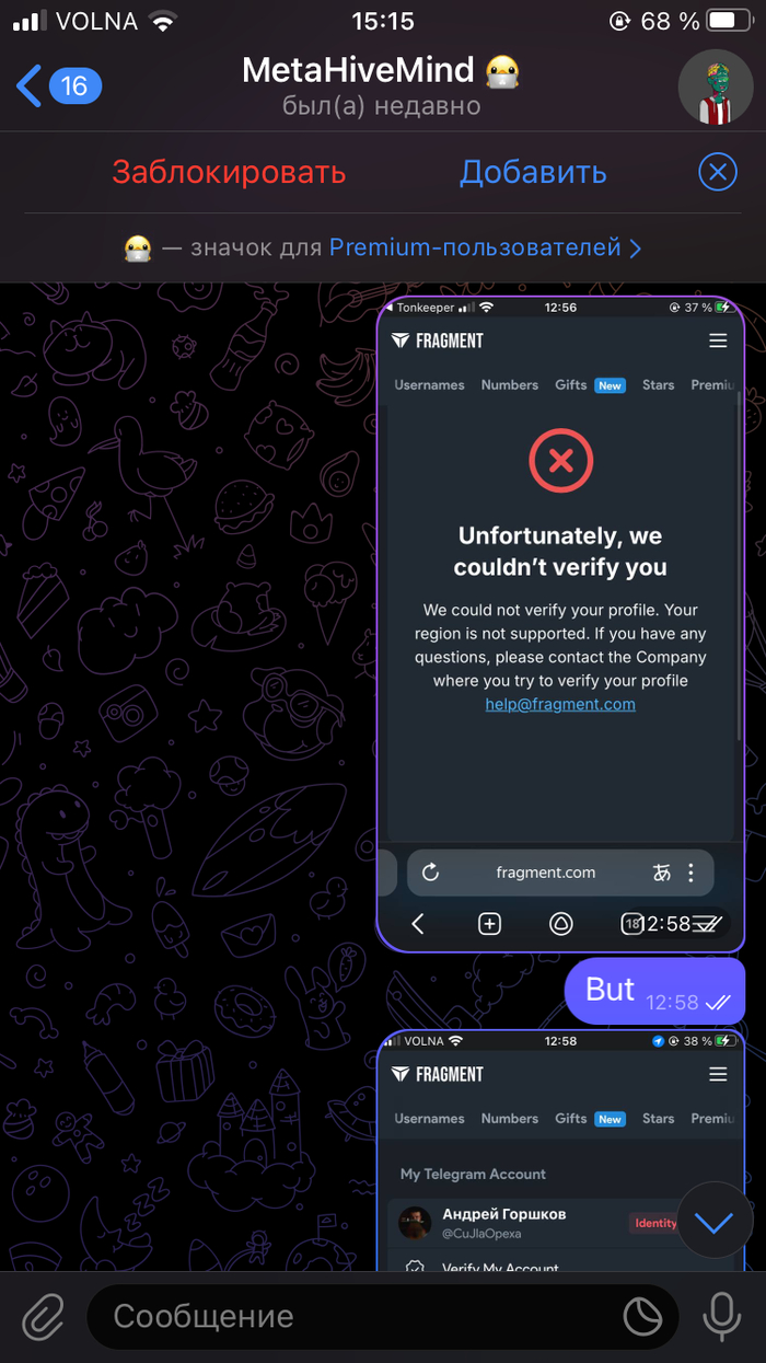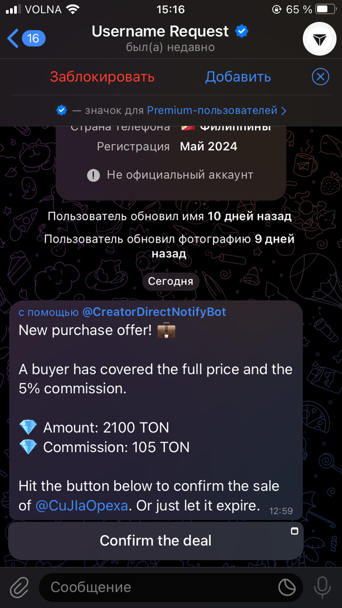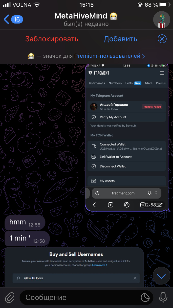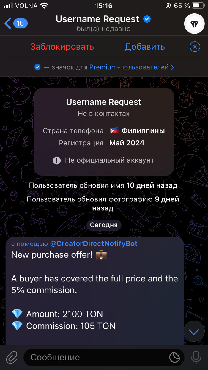 Может кому будет полезно. Сразу к сути: написал мне в личку «англичанин» и пишет соответсвующе, мол хочет купить мой username в telegram через площадку fragment. Предложил кучу денег, я начал искать инфу и понял, что это развод. По итогу, я, почему-то, написал ему в личку по-русски, -«переводи деньги, а я, как честный человек, отдам тебе логин/пароль». На что он мне моментально начал на чистом русском отвечать, что я не честный человек, что он мне не верит и поругался.