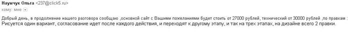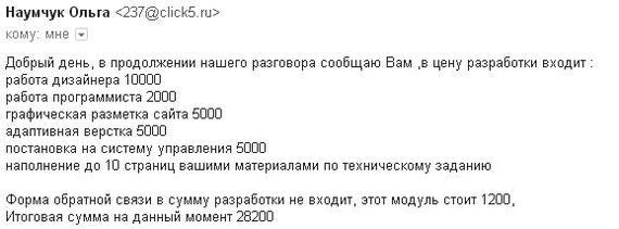 Мне эти варианты, конечно не понравились, я хотел простой, но в тоже время оригинальный сайт. Конечно же у Телеком медиа есть услуга индивидуальный сайт от 25 000 рублей. Уточняю все у менеджера, рассказываю максимально, что я хочу и как это должно выглядеть, составляю письмо и прилагаю кучу сайтов с комментариями. Также уточняю все моменты - по количеству правок, и т.д. После 2-3 дней мне приходит ответ с расчетом "от" (не обращайте внимание на тех. сайт его я рассчитывал для внутренних моментов - просто знать цену).