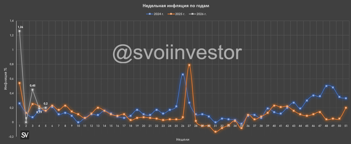 По данным Росстата, за период с 27 января по 2 февраля ИПЦ составил 0,20% (прошлые недели — 0,19%, 0,45%), с начала месяца 0,07%, с начала года — 2,11% (годовая — 6,46%). По неделькам за январь вышло 2,04% — это ~23% saar (месячная инфляция без сезонных факторов, умноженная на 12), то есть за один месяц план ЦБ выполнен наполовину (ожидают 4-5% по году), не забываем, что остаётся ещё месячный пересчёт, который в большинстве случаев показывал выше цифры (недельная корзина включает мало услуг). Начальные темпы февраля продолжают находиться на высоком уровне (плодоовощная корзина, тарифы ЖКХ, топливо), стоит, конечно, дождаться следующей недели, когда некоторые факторы уйдут, но вряд ли она повлияет на решение ЦБ по ключевой ставке. Отмечаем факторы, влияющие на инфляцию: