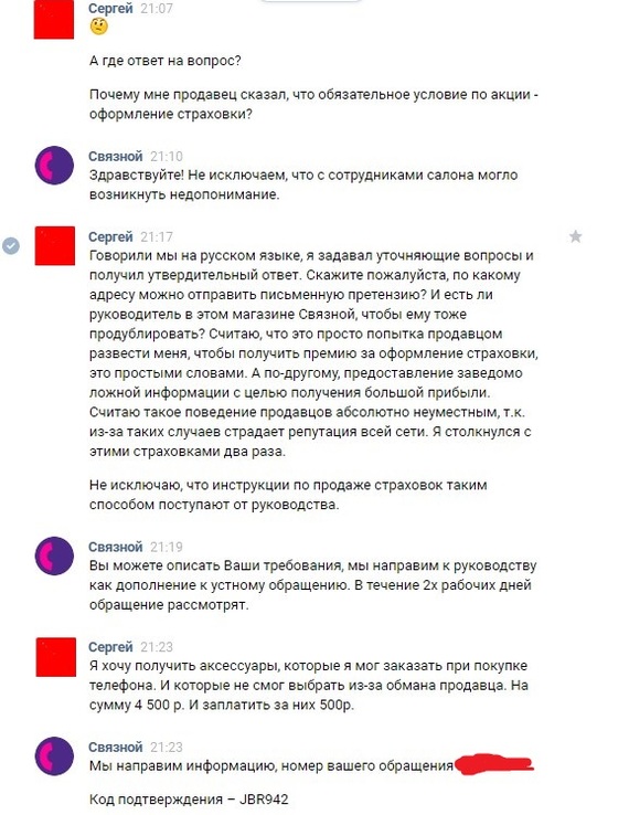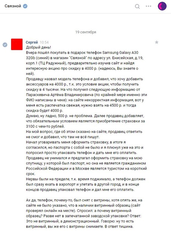 На следующий день, то есть вчера (08.10.2019) с моей девушкой созванивается кто-то со Связного, и сообщает: