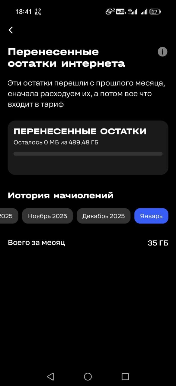 На моем тарифе Теле2 остатки трафика переносятся на следующий месяц. Каждый месяц 17 числа 35 гб суммируются к уже имеющимся там. Трафик тратится сначала из этой "копилки" перенесённых остатков, а если она закончится - то из основного пакета гБ за текущий месяц (до чего я не доводил уже 14 месяцев). Накопил я таким образом 489 гБ и поехал 17 января в командировку на 4 недели. Тут мне еще дали 15 гБ за "сколько то лет вместе", итого полтерабайта трафика. Казалось бы - ничего себе! Раздавай, играй, смотри хоть обсмотрись, точно хватит. Но тут ххххуууууяк и они закончились. Все. Все полтерабайта. В приложении t2 так и нарисовано: 0 из 489: