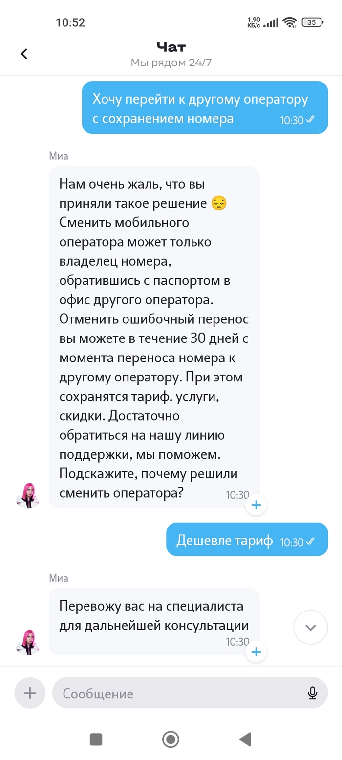 Решил написать что хочу перейти к другому оператору и о ЧУДО!! Вдруг и оператор появился и служба поддержки (не бот) работает и переключаем на специалиста....фу противно...это дно.