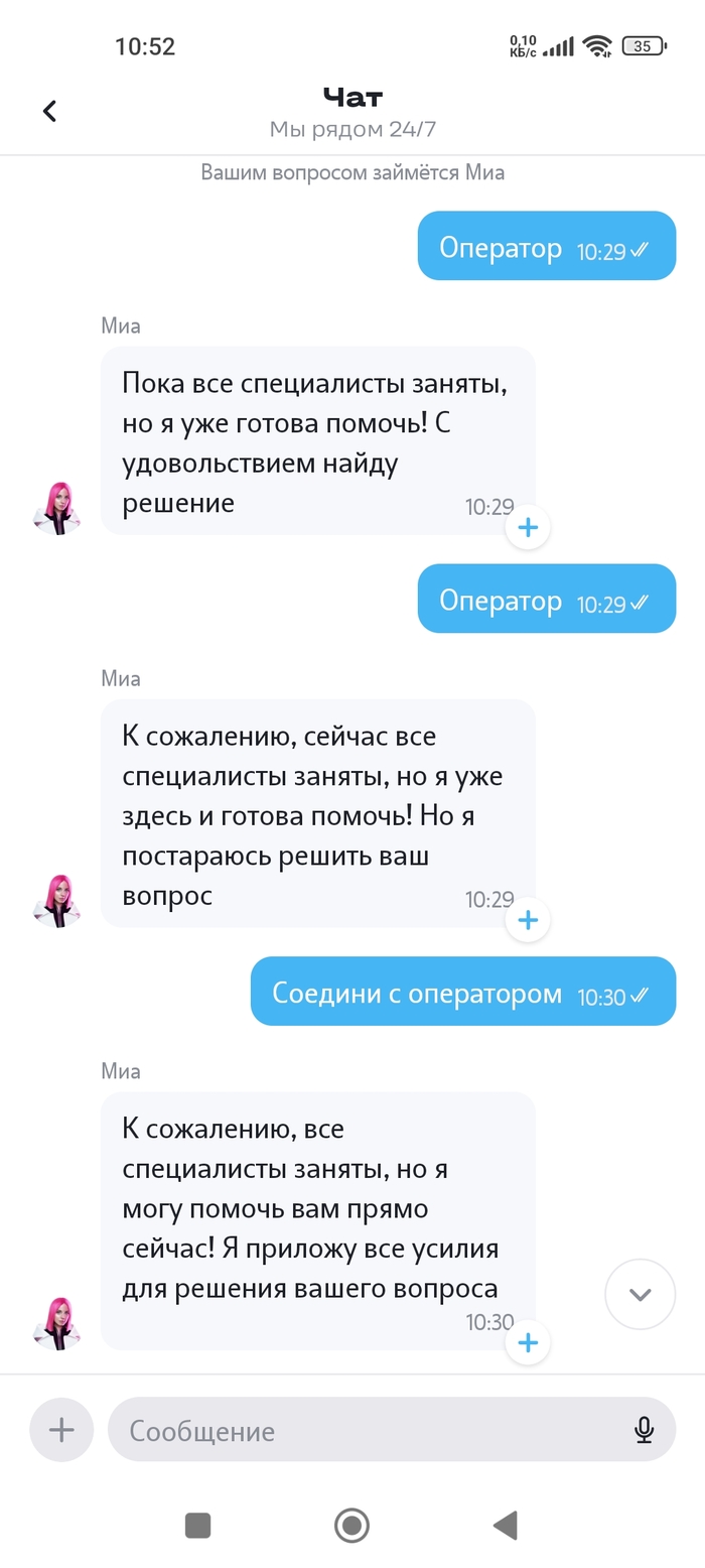 Два дня пытался выйти на живого человека и в чате и по телефону. Ничего не помогало, помогал только звонок с другого номера, как внезапно...