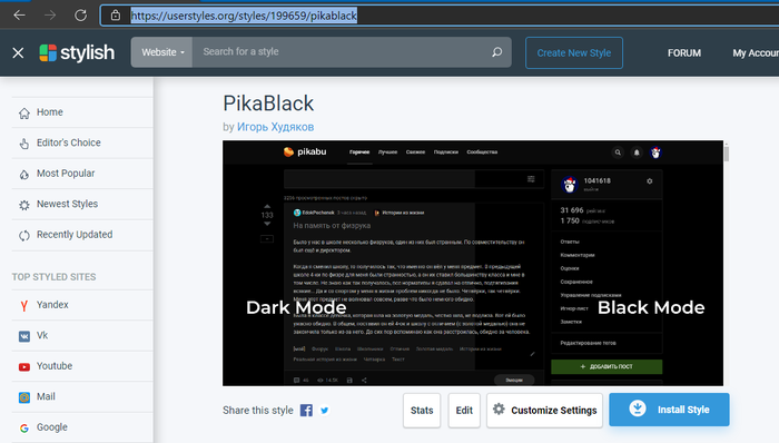 1. Переходите по ссылке на страницу с темой. Вам будет предложено установить расширение, если оно у вас ещё не установлено (вместо кнопки Install Style будет кнопка Install with Stylish, которая будет вести на страницу с расширением).