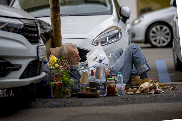 Мужчина, окруженный бутылками с водой, лежит на тротуаре в Бухаресте, Румыния