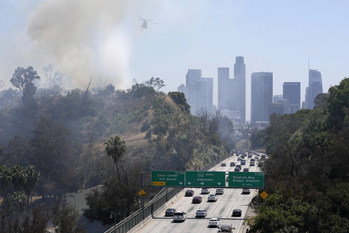 Вертолет городской пожарной службы Лос-Анджелеса сбрасывает воду на кустарниковый пожар, вспыхнувший в районе Елисейского парка в Лос-Анджелесе. Сухая и жаркая погода идеальные создает условия для природных пожаров.