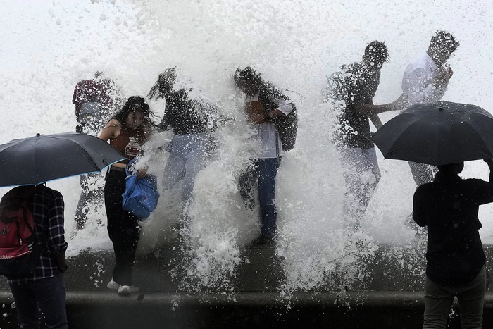 Люди охлаждаются в приливных волнах Аравийского моря в Мумбаи, Индия