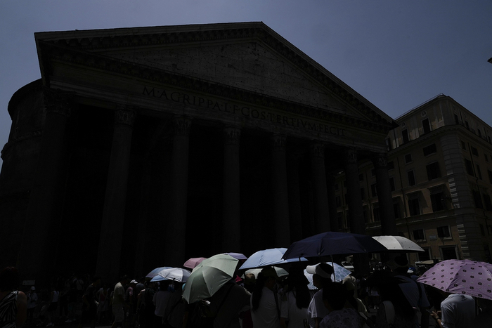 Туристы в очереди на вход в Пантеон в Риме укрываются зонтами от палящего солнца. Температура во многих городах Италии приблизилась к 40 градусам по Цельсию.