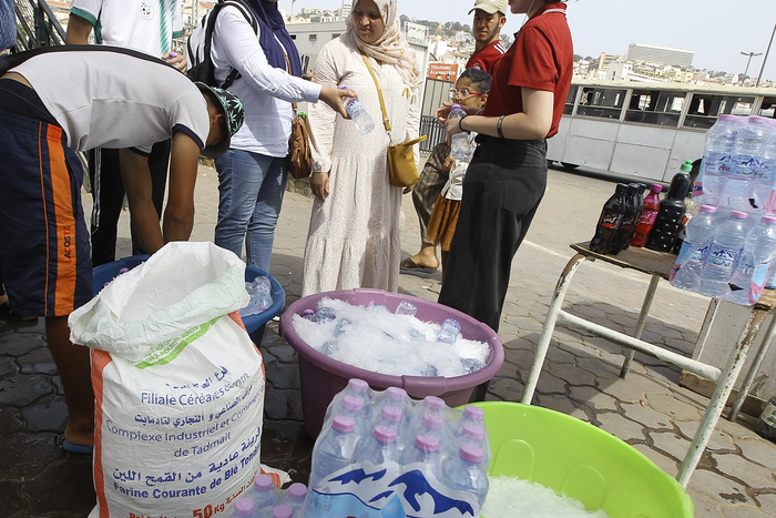 Люди покупают бутылки холодной воды у уличного продавца в Алжире,