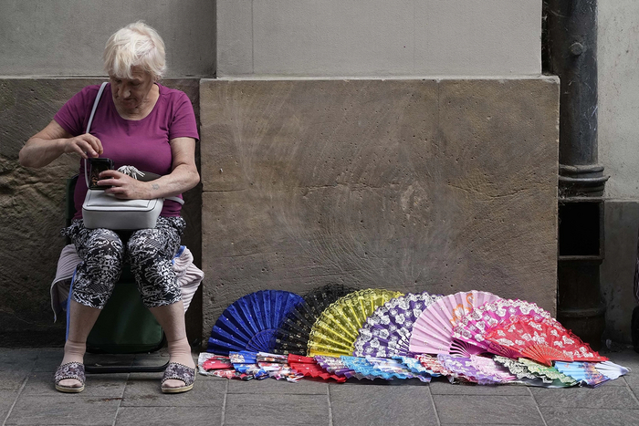 Женщина продает веера в жаркий летний день в центре Варшавы