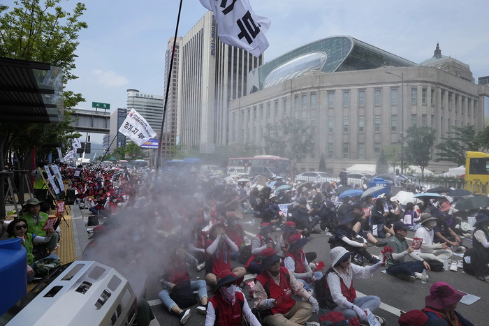 Участников митинга против трудовой политики правительства в Сеуле поливают прохладным туманом из специальных установок