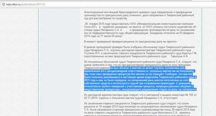 Как стало известно в ходе все того же заседания Квалификационной коллегии судей, Сергей Назаренко за личные средства пошил себе мантию судьи и продолжил исполнять обязанности судьи Темрюкского районного суда.
