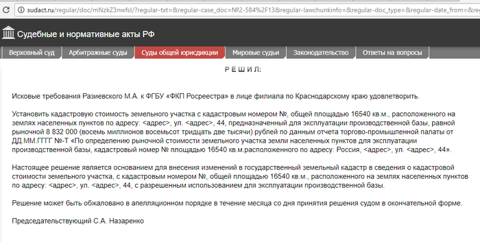 Так, исчтоник «Блокнота Краснодар», утверждает что по решению судьи Назаренко в интересах Разиевского 21.03.2013 года была уменьшена кадастровая стоимость арендованного последним земельного участка , площадь которого составила 16540 кв.м., более чем в пять раз.С 46 524 539 до 8 832 000 рублей. В результате такого решения арендная плата была уменьшена с 1 349 000 рублей в год до 278 тысяч рублей. Эксперты оценивают сумму причиненного ущерба бюджету Темрюкского района более чем в один миллион рублей.