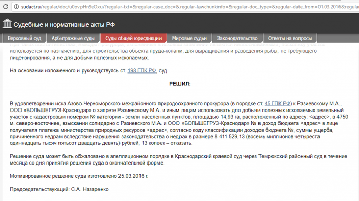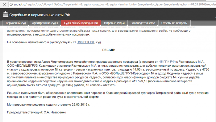 Узрел признаки коррупции источник «Блокнота» и в другом судебном деле судьи Сергея Назаренко, от 21.03.2016 года. Назаренко вновь встал на сторону господина Разиевского, отказавшись удовлетворить требования по иску Азово-Черноморского природоохранного прокурора о запрете использовать для добычи полезных ископаемых земельный участок(пренадлежащий Разиевскому) площадью 14,93 Га, расположенный в Фонталовском сельском поселении Темрюкского района. И это вопреки результатам проверки прокуратуры, согласно которым собственник земли без надлежащего на то разрешения, осуществлял добычу ископаемых на земле сельхозназначения. Словом, добычу, как может показаться, вопреки всем существующим законам, признали легальной решением суда. А действующего главу поселения — признали еще и предпринимателем, что, по мнению многих экспертов, может показаться абсурдом, а также фактом, противоречащим закону о местном самоуправлении. Так как глава не может заниматься коммерческой деятельностью.