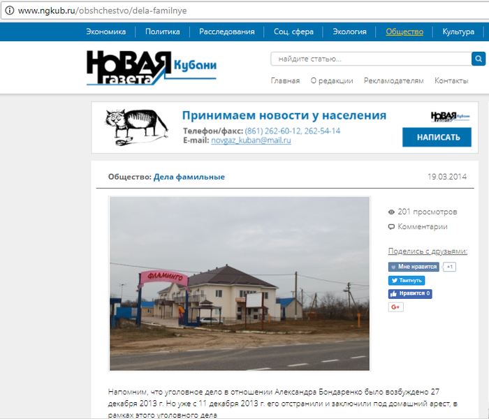Широкий резонанс в прессе в 2014 году вызвал процесс о снятии с должности главы Ахтанизовского сельского поселения Александра Бондаренко. Глава поселения выступил против выдачи разрешения на строительство газопровода в охранной зоне водоема к базе отдыха «Фламинго», принадлежащей родителям вышеуказанного судьи. За что и поплатился, по-видимому, креслом главы поселения. Об этом подробно написала «Новая газета Кубани» в статье «Дела фамильные». Далее приводим цитату из материала.