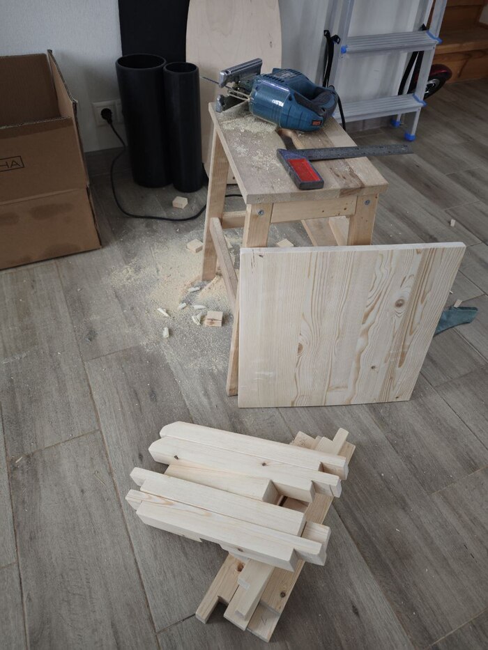 Купил два сосновых бруска 40*40*2000мм, нарезал на заготовки (38см для оснований (6 шт.), 45см для вертикальных планок (2 шт.) и 20см для горизонтальных по центру (2шт.)