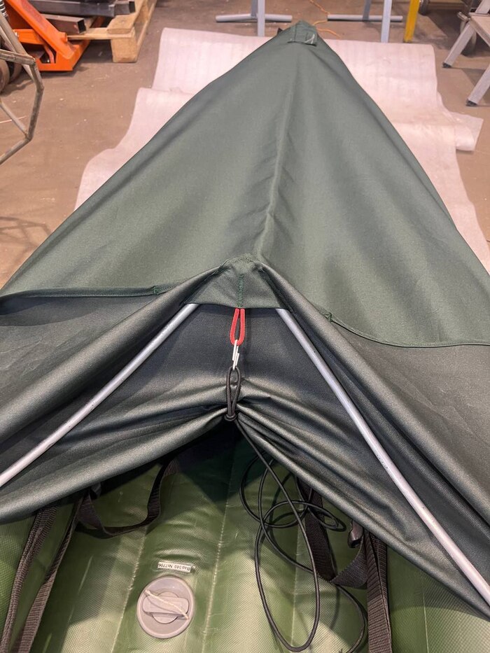 Добавил немножко автоматики. Резинка, тянется от ручки и до этой красной петельки, создает чу-чуть конек, способствующий скатываю излишков воды и препятствующий накоплению оной; так же удерживает зев лодки открытым даже при ветре - не приходится одной рукой держать весло, другой лодку, третьей собирать с воды тапки, четвертой придерживать края фартука... А так сел, ремешки затянул - она сама и закрылась в походное положение
