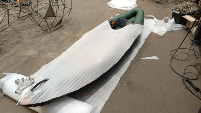 Либо такая полудека, либо из пвх, наборная. Типа как полудека на нос, на корму, а по середине откидной кус пвх с "очком" под гребца и креплением неопреновой юбки. Не нравится - дорого, тяжело... Значит ищем самоделки и находим прекрасное! На ютубе у Владимира Яковлева есть его решение этой проблемы - фартук!