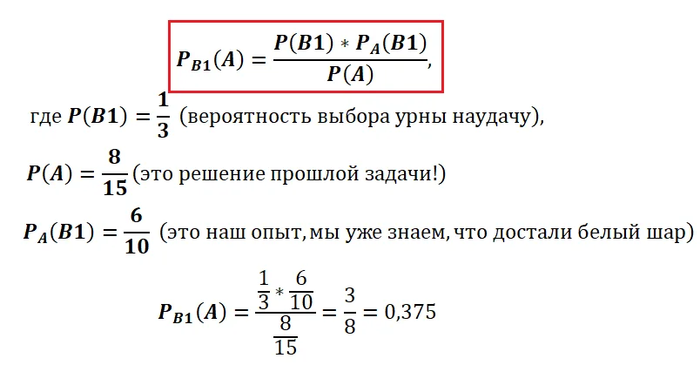 А теперь сравните две вероятности в двух задачах. В той и другой, напомню, шла речь о вытаскивании белого шара. Но в первой задаче мы искали априорную вероятность (примерно 0,533), а во второй апостериорную (0,375), т.е. уже опираясь на некий опыт.Таким образом, опыт даёт информацию для переоценки вероятности!