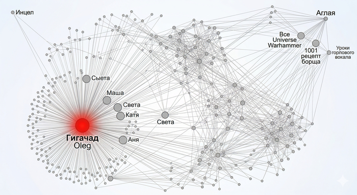 Хаб-гигачад — это узел с колоссальным показателем посредничества. Если аккаунт девушки находится в непосредственной близости к такому «шлюзу», она автоматически попадает в воронку, через которую проходят тысячи других узлов.