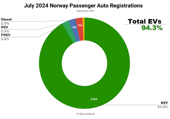 Напомню читателям что Норвегия мировой лидер по внедрению электромобилей. Следом идет Швеция 59% и Китай 50% .Страна реализует долгосрочную политику по отказу от ДВС, ожидается что 2025 год станет последним, когда на рынке присутствует ДВС. Но уже сейчас ДВС практически ушли с рынка. В июле доля ДВС на рынке продаж составила 2,9% из них продажи бензиновых составили 45 автомобилей или 0.4% электромобили заняли свыше 94% рынка.