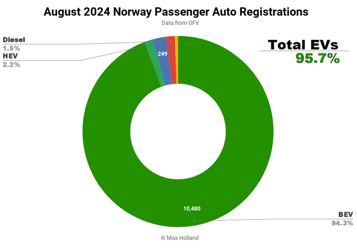 Продажи электромобилей в августе достигли нового рекорда 95,7%  Напомню  что Норвегия  планирует полностью отказаться от продаж ДВС  с 2025 года.