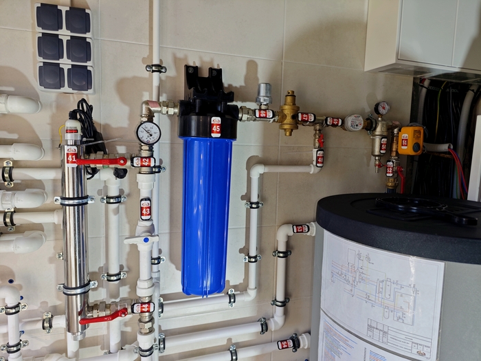 6. Сейчас заполнение/доливка бассейна производится вручную - подключением внешнего шланга к горячему душу или холодной воде сразу после очистной системы и закидыванием другого конца в бассейн. Правильно было бы подвести трубу непосредственно ко входу в теплообменник воды из бассейна - врезаться в толстую полипропиленовую трубу.