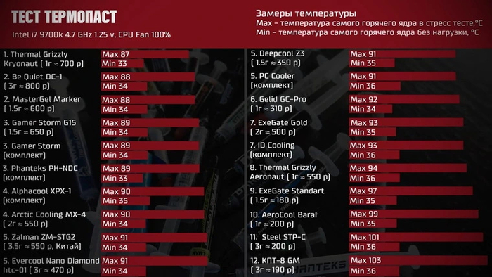 Из-за этого покупка дорогого термоинтерфейса для бюджетных чипов лишена смысла — денег вы потратите немало, а разницы в температурах практически не получите. И наоборот: не стоит приобретать к дорогим процессорам и видеокартам самый дешевый термоинтерфейс, так как с ним эффективность их охлаждения будет намного хуже.