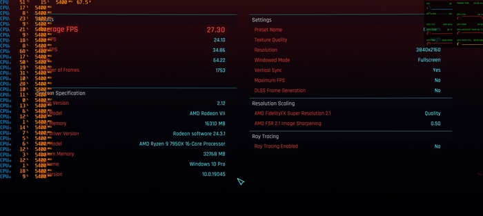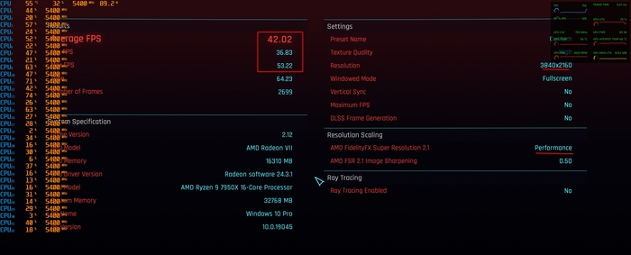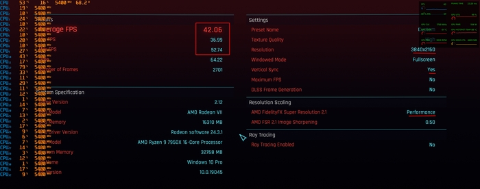 Видеокарта AMD Radeon VII c 16GB видео памяти HBM2 и шиной 4096bit. Все настройки графики максимальные, эффекты размытия отключены, AMD FSR I.S. 2.1 выставлена на 0.5, разрешение в игре 3840х2160(4К) на диагонали 27дюймов, при соотношении сторон 16 на 9.