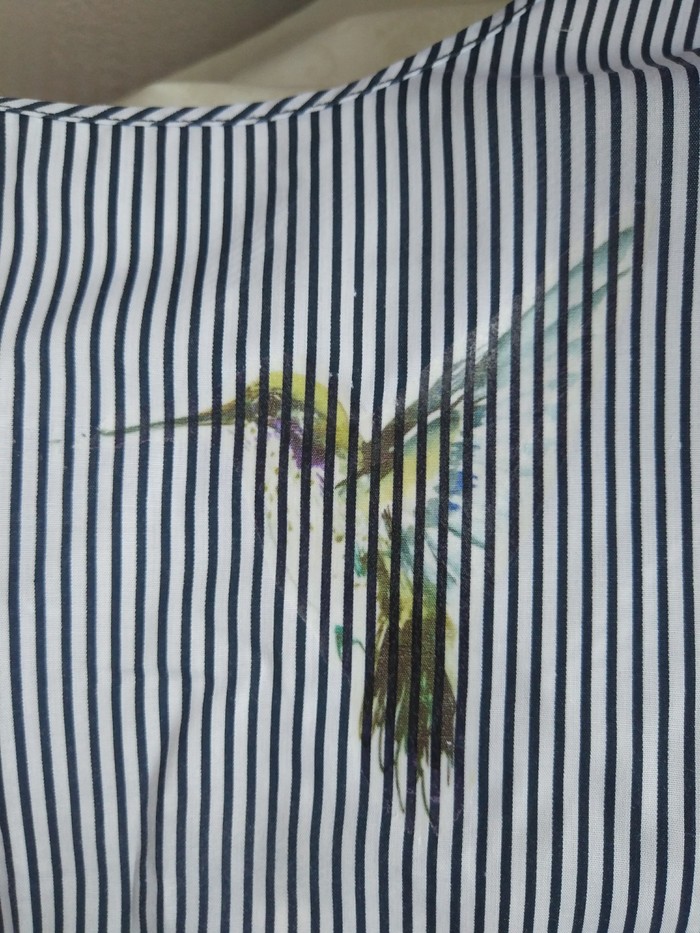 Платье я оставила себе. После ~5 ручных стирок и 1 машинной (производитель обещает 20 стирок), термотрансфер выглядит так. Прозрачная пленочка приобрела желтоватый оттенок. Клювик отвалился лишь потому, что я изначально плохо его приклеила, а потом снова попыталась это сделать 😁