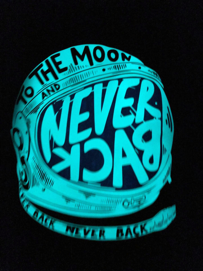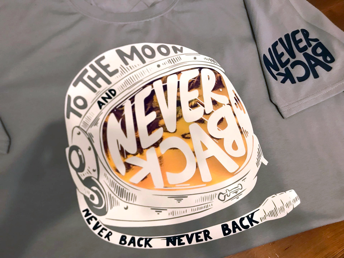 Сначала был космонавт, как эксперимент наложение разного вида пленок. Потом захотелось не яркого и в то же время привлекающего внимания. Так появилась идея обиграть логотип NASA использую термотранферные технологии.
