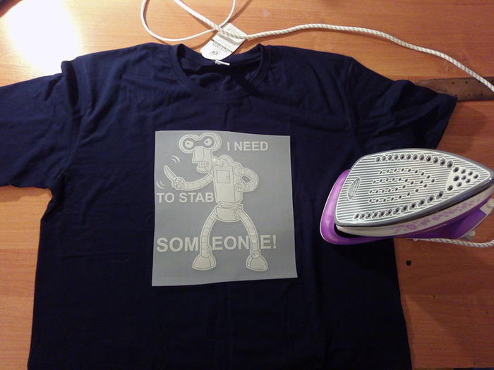 После этого надо выдрать ненужную пленку с подложки и поместить термослоем на футболку. Подложка остается сверху, через нее и через кусок марли утюгом поставленным на максимум проглаживаем наклейку. 8-10 секунд достаточно.