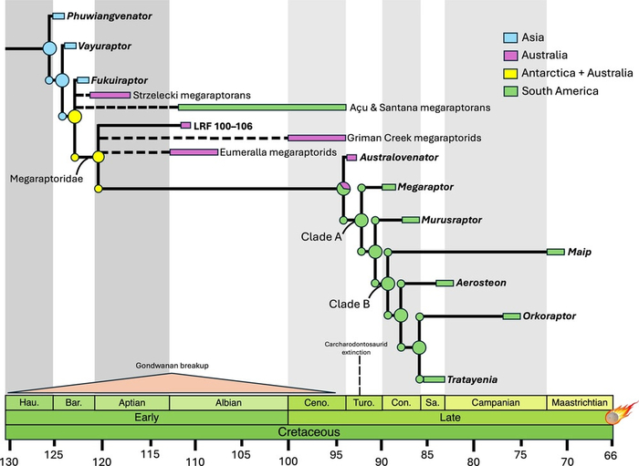 Моделирование также указывает, что гигантские размеры хищных динозавров — тираннозавров и родственных им мегарапторов, по-видимому, связаны с изменениями климата. Представители обоих родов существенно увеличились в размере после мелового термического максимума — периода глобального потепления. После сокращения парниковых газов и снижения температуры динозавры оказались более приспособленными к новым условиям.
