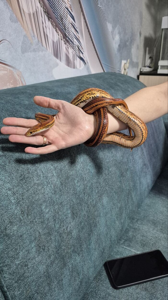 Маисовый полоз «Sunrise»: Микс Ultramel + Caramel + Stripe. Напоминает рассвет с перламутровым отливом.