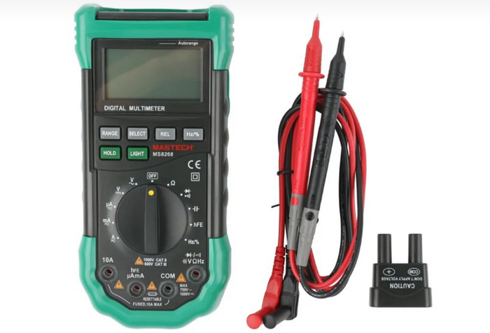 Мультиметр сочетает в себе функции вольтметра, амперметра и омметра, что позволяет измерять различные параметры электрических цепей. Можете проводить измерения постоянного и переменного напряжения, емкости, частоты, сопротивления и тока.