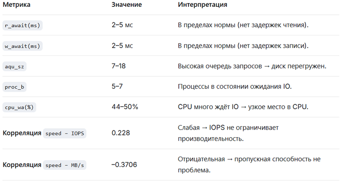 Низкая корреляция между операционной скоростью и IOPS/MB/s, что говорит о том, что узкое место — не в дисках, а в других подсистемах (CPU, блокировки, параметры СУБД).