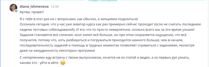 Скоро у нас на курсе появятся новые тренажеры, новые интеграции с нейросетями и новые материалы для быстрого трудоустройства. Обращался на днях ко мне товарищ за консультацией и рассказывал как он обучался у двух других менторов и увидев их программу и подход я понял, что плохо, что про нас знают мало людей! Ну ничего, это дело времени! :)