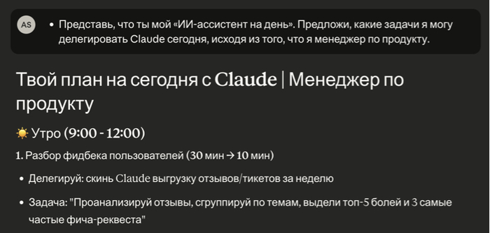 Представь, что ты мой «ИИ-ассистент на день». Предложи, какие задачи я могу делегировать Claude сегодня, исходя из того, что я менеджер по продукту.
