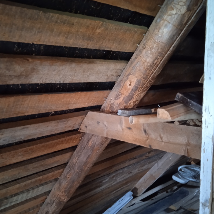 В качестве гидроветрозащиты использован пергамин, сама конструкция стропильной системы выглядит на тройку с минусом, но жизнеспособна. Многочисленные солнечные лучи, освещающие пространство сквозь металлочерепицу, как бы намекают "что-то пошло не так".