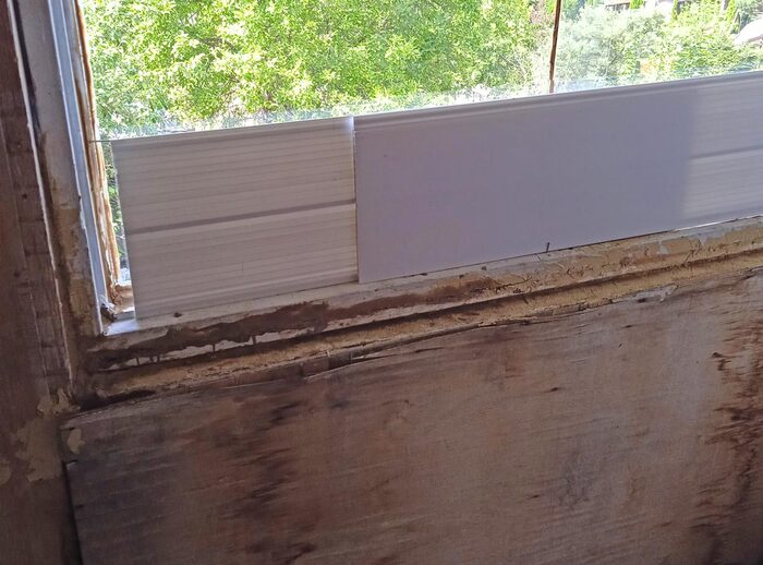Вторая беда, которая была видна невооружённым глазом с улицы, это проржавевшая металлочерепица, которая к тому же была уложена с нарушениями технологии. Честно говоря, у меня были подозрения, что кровля пострадала от пожара, но они не подтвердились. На всей южной стороне дома краска слезла и облупилась. Коррозия не заставила себя ждать.