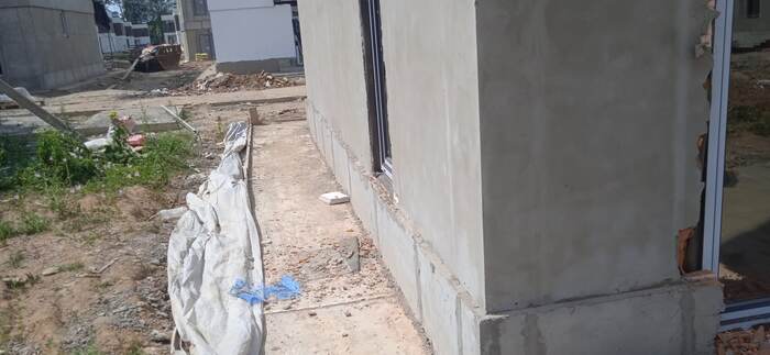 Бонусом - отсутствие гидроизоляции отмостки, которая выполнена из обычной плитки и местами выпучена морозом. Понятно, что при такой глубине цоколя она вроде бы и не нужна, но по факту это одно из условий превращения подвала в бассейн.