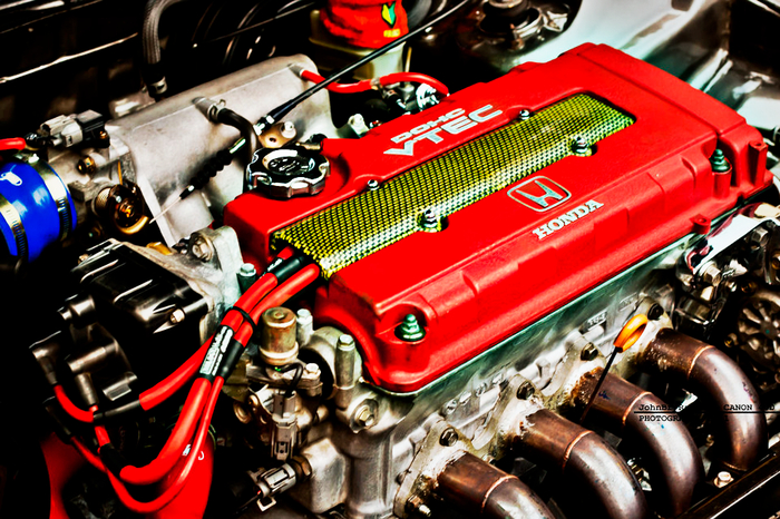 Honda B18C - четырёхцилиндровый мотор 1.8 литра, 170 сил. Алюминиевый блок с чугунными гильзами. Кривошипно-шатунный механизм сбалансирован до миллиграмма. VTEC - система изменения фаз газораспределения. Всё это работало до 300 тысяч километров без капиталки.