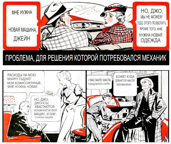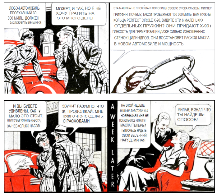 Итак, как же заинтересовать читателей Saturday Evening Post поршневыми кольцами? Создав увлекательную историю — например, короткую семейную драму, какую они могли бы услышать по радио. В данном случае чрезмерный расход масла разрушает семейный бюджет Гриффинов, и миссис Гриффин, очевидно, скоро будет ходить в лохмотьях. Но, к счастью, поршневые кольца Perfect Circle предлагают решение. А пока мы узнаем несколько интересных фактов об обслуживании автомобилей в 1930-х годах. (Кстати, реклама представлена здесь полностью. Мы лишь немного подчистили и переместили её, чтобы сделать её читабельной в интернете.)