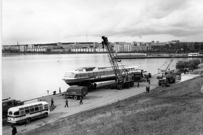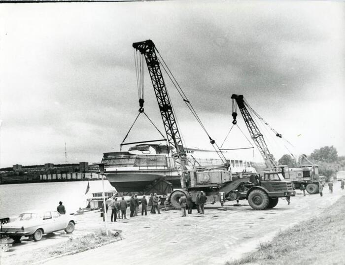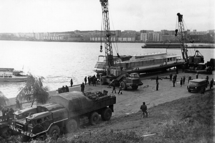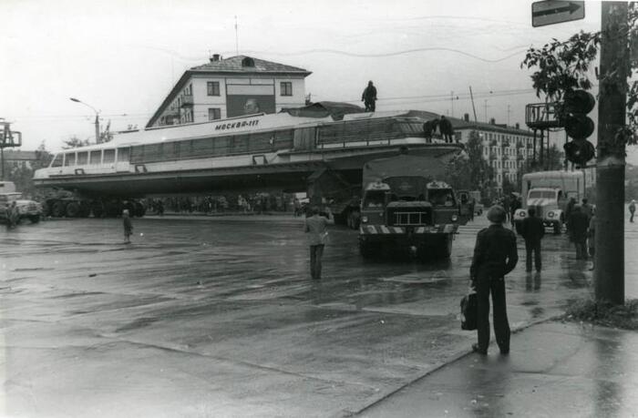 Транспортировка теплохода Москва-117 с реки Кама (Гольяны) до Ижевского пруда. Тащили Ураганом. Примерно 1982-й год.