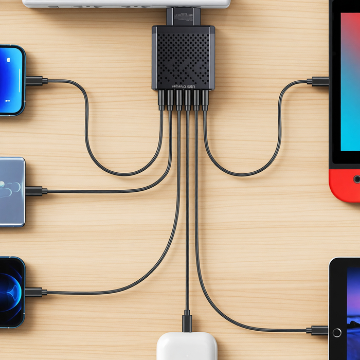 При одновременной зарядке шести приборов мощность распределяется равномерно, каждый получает необходимый ток. Зарядное имеет защиту от перегрева и скачков напряжения, что продлевает срок жизни аккумуляторов подключённых приборов.