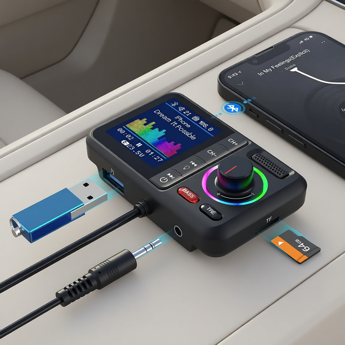 Автомобильный трансмиттер с LED-экраном крепится на вентиляционную решётку и работает с бортовой сетью 12 вольт. Цветной дисплей 3,5 дюйма показывает информацию о воспроизведении, входящих вызовах и параметрах звука, не отвлекая от дороги.