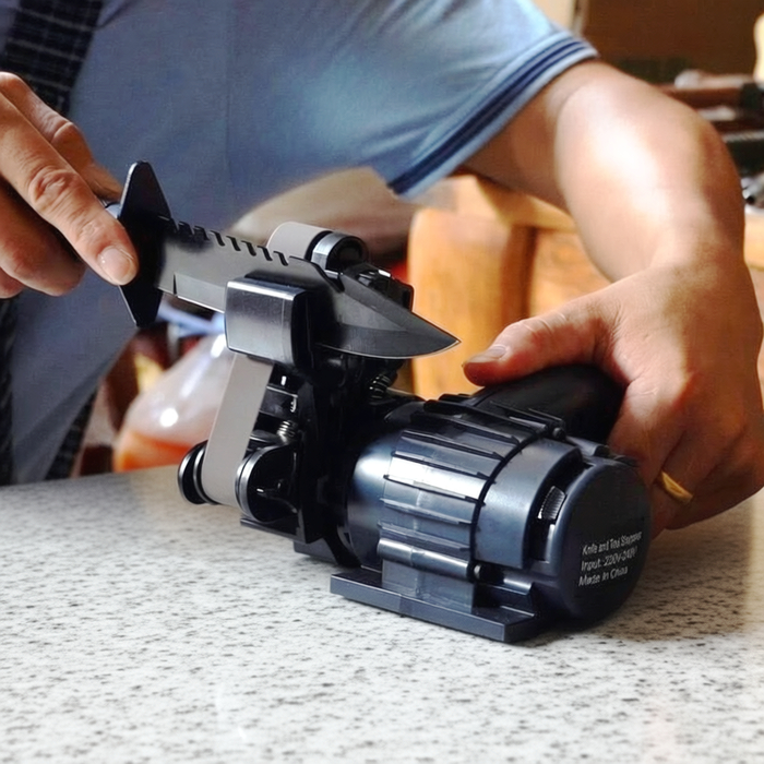 В комплекте идут насадки разной зернистости: грубая — для восстановления сильно затупившихся кромок, мелкая — для финишной полировки и гладкого среза. Это надёжный помощник для тех, кто ценит остроту и порядок на кухне или в мастерской.