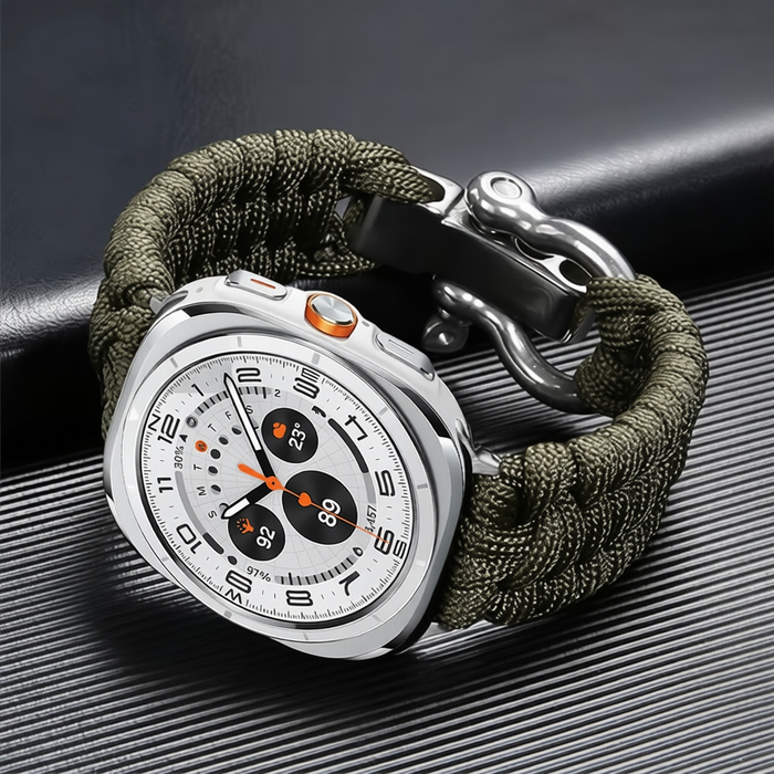Ремешок совместим с Galaxy Watch Ultra и крепится через стандартные пазы без дополнительных инструментов. Длина регулируется через набор отверстий, охватывая запястья от 150 до 220 мм. Вес ремешка составляет около 8 граммов, поэтому он не добавляет ощущаемую нагрузку на руку.