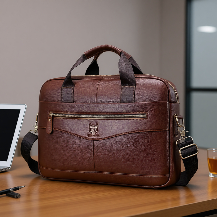 Деловой портфель бренда BULLCAPTAIN сшит из натуральной коровьей кожи и оснащён мягкими ручками для переноски. Внутри помещается ноутбук диагональю до 14 дюймов, при этом края кожи защищают экран от царапин во время движения.